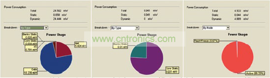 圖 1: IC 組件處于完全打開(左)、睡眠模式(中)和 80% 睡眠模式和20% 打開模式的組合(右)時的功耗。