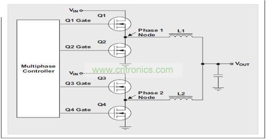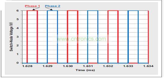 圖1 顯示了一款二相電路。由該電路的波形(圖2 所示)可以清楚地看到各相互相交錯(cuò)。這種交錯(cuò)可減少輸入和輸出紋波電流。另外,它還減少了印刷電路板或者某個(gè)特定組件上的熱點(diǎn)。實(shí)際上,二相降壓轉(zhuǎn)換器讓FET 和電感的RMS-電流功耗降低了一半。相交錯(cuò)還可以降低傳導(dǎo)損耗。