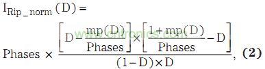 其中,D 為占空比,IRip_norm 為標(biāo)準(zhǔn)化的紋波電流,其為D 的函數(shù),而mp 為m 的整數(shù)。圖3 為這些方程式的曲線圖。例如,20% 占空比(D) 時(shí)使用2 個(gè)相,可降低25% 紋波電流。電容器必須承受的紋波電壓大小,可通過(guò)紋波電流乘以電容器的等效串聯(lián)電阻計(jì)算得到。很明顯,最大電流和電壓要求都降低了。
