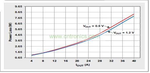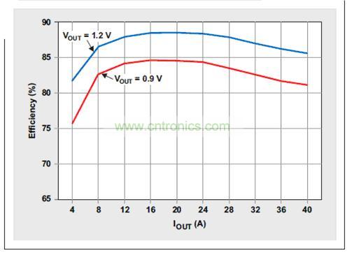 由于每個(gè)相位的功率級(jí)電流更低,多相實(shí)現(xiàn)的輸出濾波器要求也隨之降低。對(duì)于一款40-A 二相解決方案來(lái)說(shuō),向每個(gè)電感提供的平均電流僅為20A。相比40-A 單相方法,由于平均電流和飽和電流更低,電感和電感器體積都大大減小。