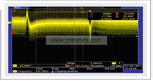 圖10 瞬態(tài)響應(yīng):10-A負(fù)載步長(zhǎng)20 µs(過(guò)沖/下沖約27 mV)