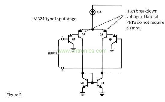使用橫向PNP 輸入晶體管的通用運算放大器一般沒有輸入鉗位,例如:LM324" target="_blank" title="Link to Product Folder">LM324、LM358" target="_blank" title="Link to Product Folder">LM358、OPA234" target="_blank" title="Link to Product Folder">OPA234、OPA2251" target="_blank" title="Link to Product Folder">OPA2251 和OPA244" target="_blank" title="Link to Product Folder">OPA244。這些運算放大器一般為“單電源”類型,其意味著它們擁有一個擴展至負電源端(或者稍低)的共模范圍。輸入偏置電流為一個負數時,表示輸入偏置電流自輸入引腳流出。這時,我們通??梢哉J定它們?yōu)檫@類運算放大器。但是,需要注意的是,使用PNP 輸入的高速運算放大器一般有輸入鉗位,而這些PNP 是一些具有更低擊穿電壓的垂直PNP。