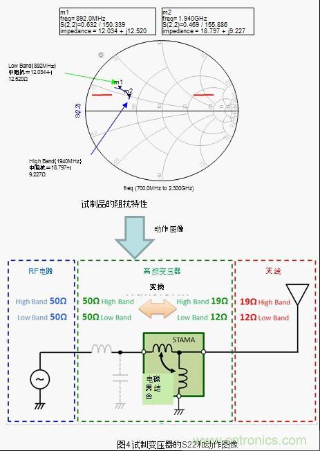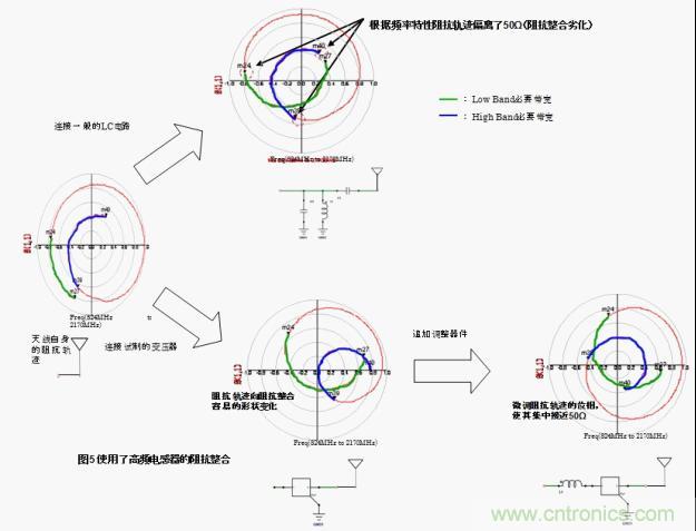 將普通的LC電路跟天線連接,根據頻率特性的不同在廣帶寬情況下阻抗整合會變得困難。針對該情況,將本次試制的高頻變壓器跟天線連接,low band和high band都轉換成了最合適的阻抗。也就是說,工匠圖上的阻抗軌跡有可能變化成阻抗整合容易的形狀。之后通過外部的調節(jié)元件將阻抗軌跡的相位進行微調,有可能非常容易的就集中在50Ω附近了。(圖5)