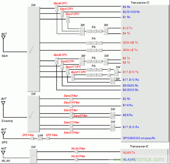圖2:GSM/UMTS/LTE對(duì)應(yīng)終端的前端配置的示例