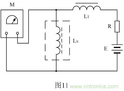 這里順便說明,采用圖7測試時應(yīng)該注意的地方。圖7中,隔離電感LT的數(shù)值要求是測試電感Lx數(shù)值的3倍以上,并且測量高壓包初級線圈的初始電感值L0時,最好也要接入電路之中。這里,隔離電感LT可選取20毫亨以上的矽鋼片直流電感,電感的鐵芯要留有氣隙;流電源可用一個穩(wěn)壓電源與一個大功率電阻串聯(lián)代替,如圖11,或用一個穩(wěn)壓電源與一個大功率晶體放大器串聯(lián)來代替,如圖12。