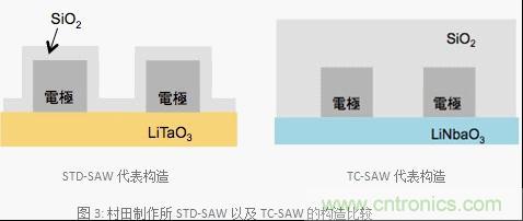 圖3是村田制作所STD-SAW以及TC-SAW構造的示意圖。SAW雙工器的頻率溫度依賴性是由于使用了壓電電路板造成的。此外,STD-SAW、TC-SAW都是因為使用的壓電電路板具有頻率溫度依賴性的相同特點。如圖3所示,TC-SAW最具代表性的特征之一是整塊電路板跟STD-SAW相比它的表面覆蓋了一層很厚的二氧化硅(SiO2)。壓電電路板的溫度上升的話頻率就會降低,那么頻率溫度系數就會變成負值。另外,SiO2具備正頻率溫度系數的特點。因此,和STD-SAW相比的話由于覆蓋了一層厚SiO2的獨特構造,SiO2的正頻率溫度系數的影響會變大,那么SAW雙工器與STD-SAW相比就實現了抑制頻率溫度依賴性的特點。STD-SAW的保護膜SiO2具有強大的特質,如果覆蓋了像TC-SAW一樣厚的SiO2的話就不能保證帶寬,同時也不能獲得優(yōu)良的特性。因此,TC-SAW將電路板的材料從LiTaO3變成了LiNbaO3,才能夠確保必要的帶寬。此外,TC-SAW的LiNbaO3的切割角發(fā)生了變化使得頻率選擇性變得可控制,村田制作所運用了對應項目的必要特性設計了符合市場需求的最佳切割角。