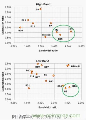 雙工器的設計根據Third Generation Partnership Project (3GPP)的規(guī)格根據頻帶的送信和收信帶寬以及送信端和收信端的頻率間隔(Separation ratio)決定了其難易度。一般來說頻率的帶寬越廣那么送信端和收信端的頻率間隔越小難易度就越高。總結兩者的關系來看,如圖4。村田制作所正致力于圖4中圈出的部分,計劃優(yōu)先實現TC-SAW對應的產品。