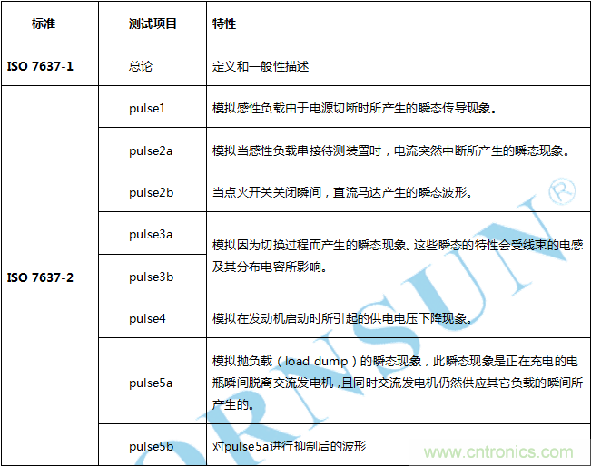 針對汽車電子自身產(chǎn)生的干擾,國際無線電干擾委員會(CISPR)對汽車電子業(yè)提出了嚴格的要求,尤其是車載收音機、數(shù)字電視、導(dǎo)航設(shè)備都是這種干擾的重災(zāi)區(qū)。所以 CISPR25:用于保護車載接收機的無線電騷擾特性的限值和測試方法,對汽車電子自身的發(fā)射狀態(tài)也有了明確的等級判定。EMS方面的測試項目如下所示: