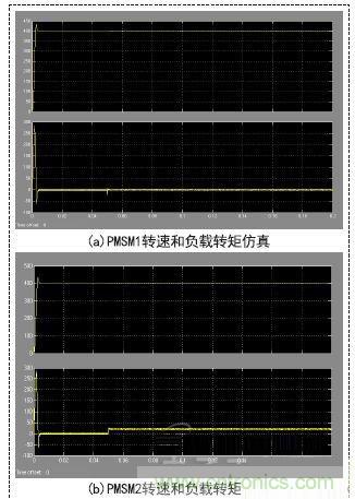 PMSM1轉(zhuǎn)速受到PMSM2負載改變的影響,出現(xiàn)微小的下降,然后快速恢復穩(wěn)定,轉(zhuǎn)矩也出現(xiàn)微小的波動后迅速恢復穩(wěn)定。說明基于svpwm調(diào)速的PID雙閉環(huán)控制系統(tǒng)有較強的魯棒性,雙電機間偏差耦合補償策略當某一電機負載改變時,另一個電機有良好的跟隨性能。