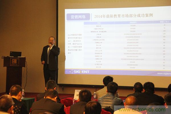 會議伊始,鼎陽科技董事長兼總裁秦軻先生進(jìn)行了精彩致辭,總結(jié)了鼎陽科技在2014年取得的巨大成就,展望了鼎陽科技在2015年的宏偉前景,為鼎陽科技在新一年的持續(xù)高速增長擺下了棋陣。2014年鼎陽科技的銷售額增長了41%;MSO2000、SDS3000、SDM3000在取得了眾多工藝上的突破之后順利量產(chǎn)。去年,鼎陽科技美國分公司在克里夫蘭正式成立,為北美市場的下一輪增長做了堅實的鋪墊。2014年,鼎陽科技參加了海內(nèi)外的多個大型展會,標(biāo)志著鼎陽科技正式立足于測試測量儀器領(lǐng)域主流品牌的行列。與此同時,鼎陽科技與廣州工業(yè)大學(xué)深度合作,建立了聯(lián)合實驗室,第一屆鼎陽杯也圓滿落幕,增強(qiáng)了鼎陽科技在高校用戶群體中的知名度,進(jìn)一步鞏固了鼎陽科技在教育領(lǐng)域的影響力。