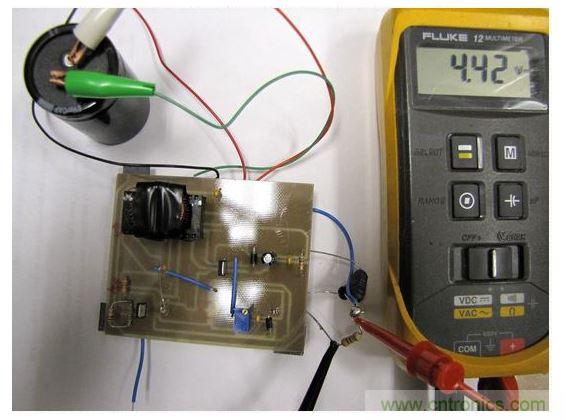 Q2(IRLU3103)是用于調(diào)節(jié)的另外一個(gè)MOSFET。Q2的閾值電壓用于調(diào)節(jié)輸出電壓。當(dāng)輸出達(dá)到5V時(shí),由R1和R2組成的分壓電路使得Q2導(dǎo)通,振蕩停止,進(jìn)而導(dǎo)致輸出電壓下降。由于這個(gè)閾值電壓的變化不是很急劇,調(diào)節(jié)效果通常不是很好。