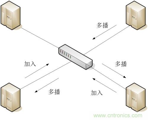 當(dāng)一臺裝置想加入某個多播組時,首先發(fā)出GMRP加入報(bào)文,交換機(jī)將接到的GMRP加入報(bào)文的端口加入該多播組,并在VLAN中廣播該GMRP加入報(bào)文,VLAN中的多播源就知道了多播成員的存在。當(dāng)組播源向組播組發(fā)送組播報(bào)文時,交換機(jī)只把該報(bào)文從先前加入到該組播組的端口轉(zhuǎn)發(fā)出去,從而實(shí)現(xiàn)VLAN內(nèi)的二次組播。如圖 1-2所示。