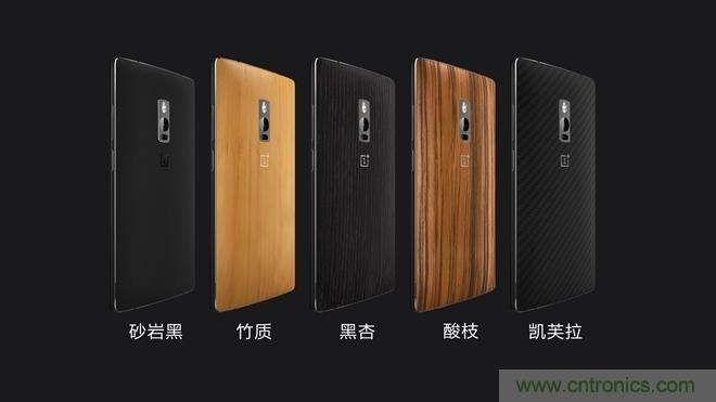 外觀上一加2以1代產品為基礎,在手感、質感上兩個詞上下功夫。新機采用金屬材質邊框,并調整邊框背面弧度使之更貼合;材質方面,新品擁有砂巖黑、竹質、黑杏、酸枝、凱芙拉共計五種后殼版本。盡顯復古,原始,典雅風格。側面金屬的加入和可更換后殼,讓手感做出提升和差異化。