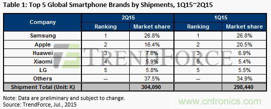 【導(dǎo)讀】近日,市場研究機構(gòu)TrendForce發(fā)布2015年度第二季度全球智能手機報告。中國的華為明顯獨領(lǐng)風騷。數(shù)據(jù)顯示,三星雖然從蘋果手里奪回第一的寶座,但是,Q1和Q2 幾乎毫無變化。蘋果的市場份額則一調(diào)再掉,從Q1的20.5%掉到Q2的15.4%。華為的市場份額增加了7%,小米的份額增加了5%。