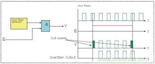 圖1:兩種選通脈沖串的方法,一種是使用選通信號(hào)E和與門(Y輸出),一種是量化器(藍(lán)色)。