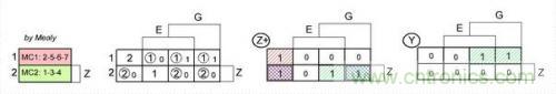 現(xiàn)在就很容易畫出壓縮的狀態(tài)轉(zhuǎn)換表,并為Z編碼的內(nèi)存單元和輸出選通信號(hào)Y畫出卡諾-維奇圖(圖4)。