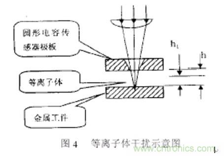 在工件尚未被切穿的瞬間,激光和金屬相互作用,在噴嘴和加工對(duì)象之間產(chǎn)生云霧狀等離子體,改變電容極板之間的介質(zhì),從而對(duì)電容傳感器產(chǎn)生干擾。在正常切割過(guò) 程中,輔助氣體將等離子體從切縫中吹散,對(duì)電容傳感器產(chǎn)生影響較小。但假如加工速度太快和剛開(kāi)始切割時(shí),由于工件未被完全切穿,激光照射點(diǎn)四周會(huì)產(chǎn)生等離 子體云,對(duì)電容傳感器產(chǎn)生干擾,嚴(yán)重時(shí)甚至使傳感器無(wú)法正常工作,嚴(yán)重影響加工質(zhì)量。圖4為等離子體干擾示意圖。