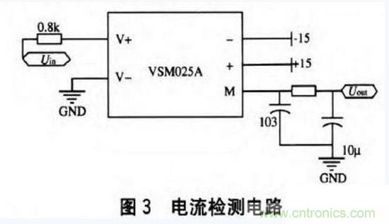 系統(tǒng)所要檢測的信號采用霍爾傳感器法檢測,如被測電源設(shè)備向該簡易直流電子負(fù)載輸入的電壓,以及流進(jìn)負(fù)載的電流。電壓和電流檢測分別通過電壓霍爾、電流霍爾傳感器檢測,并經(jīng)過必要的輸出轉(zhuǎn)換電路后轉(zhuǎn)換為檢測信號。為了提高系統(tǒng)的抗干擾性,檢測信號經(jīng)過一個低通濾波器濾除噪聲,再送入單片機的AD轉(zhuǎn)換器中。其中電流霍爾的原理圖如3所示。