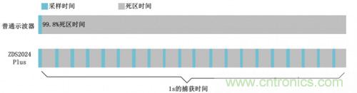 上圖4和表1為ZDS2024 Plus示波器與普通示波器的死區(qū)時間對比,在相同的時基檔位下,ZDS2024 Plus有效采樣時間為23.1%,普通示波器有效采樣時間為0.2%,相當于在1s內(nèi)ZDS2024 Plus采集231ms,而普通示波器僅僅采集了20ms,相差20倍以上,如圖5所示。