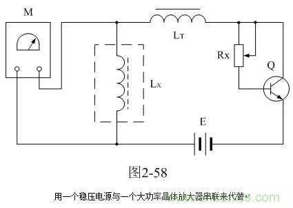 在圖2-58中,E為穩(wěn)壓電源,Rx為可調(diào)電阻,Q為晶體管大功率放大器(必須帶散熱片);調(diào)節(jié)穩(wěn)壓電源的電壓輸出,或改變可變電阻的阻值,就可以改變迭加電流的大小,但晶體管大功率放大器集電極與發(fā)射極之間的電壓降不要大于10V,否則,晶體管大功率放大器的損耗將很大。一般穩(wěn)壓電源都有電流輸出指示,所以在測試電路中不需要另外安裝電流表。