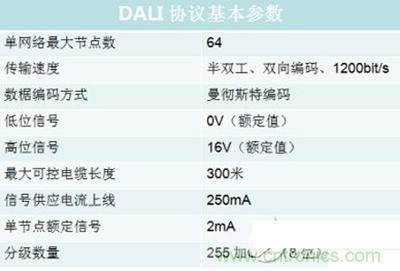 DALI數(shù)字式可尋址燈光接口(Digital Addressable LighTIng Interface)鎮(zhèn)流器是當(dāng)前最新的可調(diào)光熒光燈鎮(zhèn)流器。DALI是一個(gè)數(shù)據(jù)傳輸?shù)膮f(xié)議,它定義了電子鎮(zhèn)流器與設(shè)備控制器之間的通信方式,基于DALI 協(xié)議組建的系統(tǒng)具有分布式智能模塊, 各個(gè)智能化DALI 模塊都具有數(shù)字控制和數(shù)字通信能力, 地址和燈光場(chǎng)景信息等都存儲(chǔ)于各個(gè)DALI 模塊的存儲(chǔ)器內(nèi)。DALI 模塊通過DALI 總線進(jìn)行數(shù)字通信、傳遞指令和狀態(tài)信息,實(shí)現(xiàn)燈的開關(guān)、調(diào)光控制、系統(tǒng)的設(shè)置等功能。DALI總線制定一個(gè)系統(tǒng)結(jié)構(gòu)簡(jiǎn)單、安裝方便、操作容易、功能良優(yōu)的燈光控制系統(tǒng),可用于一個(gè)房間內(nèi)的燈光控制,還可以連接更高級(jí)的設(shè)備網(wǎng)絡(luò),如以太網(wǎng),以支持更多的設(shè)備和足夠的網(wǎng)絡(luò)帶寬。 DALI協(xié)議的基本參數(shù)如下: