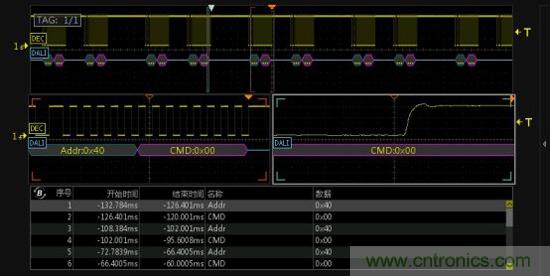 對(duì)長時(shí)間監(jiān)測(cè)的數(shù)據(jù)進(jìn)行異常分析,可在示波器的縮放模式下使用雙ZOOM多窗口顯示的功能,對(duì)信號(hào)進(jìn)行多窗口異常監(jiān)測(cè)和分析,可同時(shí)對(duì)任一數(shù)據(jù)幀和數(shù)椐幀上升沿或下降沿細(xì)節(jié)進(jìn)行分析,然后通過查看放大數(shù)椐細(xì)節(jié),事件表中的數(shù)據(jù)和波形一一對(duì)應(yīng),定位異常非常方便,如下圖7所示。