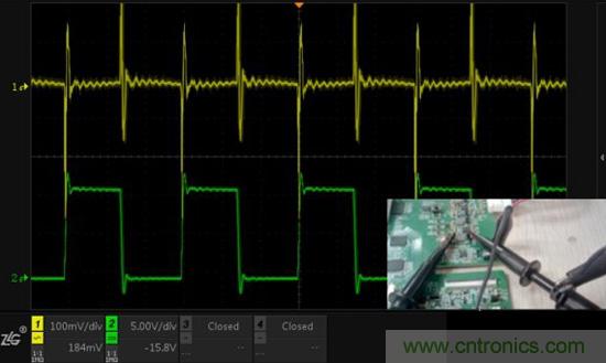 測試方法:通道1測量小信號(100mv/div),通道2測量大信號(5V/div),觀察信號互相影響的情況。