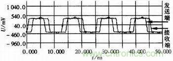 在實際的PCB布線時,如果由于產(chǎn)品結(jié)構(gòu)的需要,不能縮短信號線長度時,應采用差分信號傳輸。差分信號有很強的抗共模干擾能力,能大大延長傳輸距離。差分信號有很多種,如ECL、PECL、LVDS等,表1列出LVDS相對于ECL、PECL系統(tǒng)的主要特點。LVDS的恒流源模式低擺幅輸出使得LVDS能高速驅(qū)動,對于點到的連接,傳輸速率可達800Mbps,同時LVDS低噪聲、低功耗,連接方便,實際中使用較多。LVDS的驅(qū)動器由一個通常為3.5mA的恒流源驅(qū)動對差分信號線組成。接收端有一個高的直流輸入阻抗,幾科全部的驅(qū)動電流流經(jīng)10Ω的終端電阻,在接收器輸入端產(chǎn)生約350mV電壓。當驅(qū)動狀態(tài)反轉(zhuǎn)時,流經(jīng)電阻的電流方向改變,此時在接收端產(chǎn)生有效的邏輯狀態(tài)。圖5是利用LVDS芯片DS90LV031、DS90LV032把信號轉(zhuǎn)換成差分信號,進行長距離傳輸?shù)牟ㄐ螆D。在仿真時設(shè)置仿真頻率為66MHz理想方波,傳輸距離為508mm,差分對終端接100Ω負載匹配傳輸線的差分阻抗。從仿真結(jié)果看,LVDS接收端的波形除了有延遲外,波形保持完好。