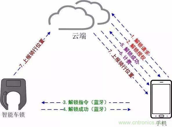 2.云端完成對(duì)用戶和單車的信息核查,并將解鎖指令發(fā)送給單車智能鎖,智能鎖開(kāi)啟后向云端回復(fù)“解鎖成功”。(備注:部分共享單車在解鎖信息上報(bào)過(guò)程中,智能鎖會(huì)把下一次解鎖的密碼或秘鑰也一并上報(bào)給云端)(步驟2、3)