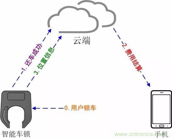 1.用戶鎖車后,由智能鎖通知云端:“還車成功”。(步驟1)
