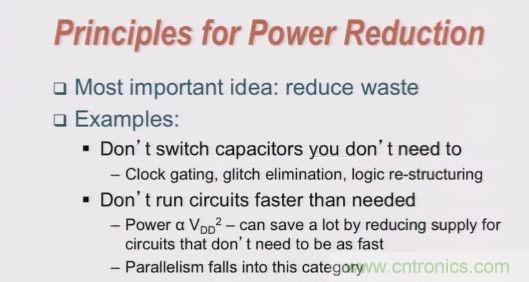 •降低頻率:利用并行處理增加電路來(lái)降頻,犧牲面積來(lái)降低功耗。