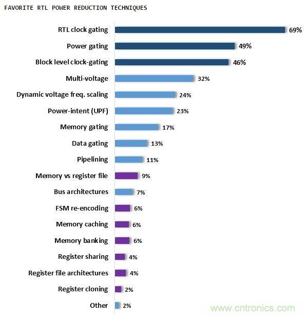 除了上述這些方法,高效的低功耗技術(shù)還有許多,比如襯底反偏(加反向電壓降低襯底漏電),多閾值單元(Multi-Vth cell)等等設(shè)計(jì)方法。下圖是一些比較熱門(mén)的RTL級(jí)低功耗技術(shù)。