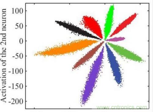 以上只是通用的CNN網絡,由于人臉識別應用中不是直接分類,而是有一個注冊階段,需要把照片的特征值取出來。如果直接拿softmax分類前的數據作為特征值效果很不好,例如下圖是直接將全連接層的輸出轉化為二維向量,在二維平面上通過顏色表示分類的可視化表示: