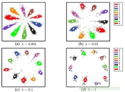 可見效果并不好,中間的樣本距離太近了。通過centor loss方法處理后,可以把特征值間的距離擴大,如下圖所示: