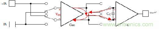 斬波零漂移放大器的內(nèi)部結(jié)構(gòu)可以具有與連續(xù)時間放大器一樣多的級數(shù)——主要區(qū)別在于第一級的輸入和輸出具有一組開關(guān),用于在每個校準周期內(nèi)反轉(zhuǎn)輸入信號。圖3顯示了前半個周期。在前半周期,兩組開關(guān)都配置為翻轉(zhuǎn)輸入信號兩次,但失調(diào)翻轉(zhuǎn)一次。這使輸入信號保持同相,但失調(diào)誤差極性相反。