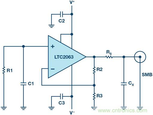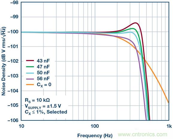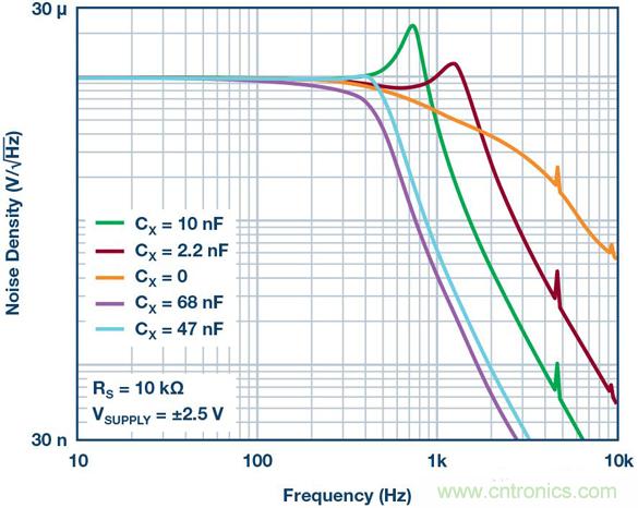 關(guān)鍵IC參數(shù)與運(yùn)算放大器電源電流有關(guān),低電源電流的器件可能需要稍大的CX,而高電源電流的器件很可能需要小于30 nF的電容,同時(shí)實(shí)現(xiàn)更寬的平坦帶寬。