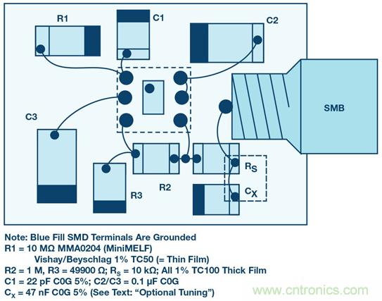 為獲得最佳精度和長(zhǎng)期穩(wěn)定性,R2、R3或RS可以是0.1%薄膜電阻,例如TE CPF0603。C2/C3可以是大多數(shù)電介質(zhì)電容中的一種;C0G可用來保證低漏電流。