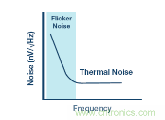 集成輸入緩沖器還有其它挑戰(zhàn)。Σ-Δ 型調(diào)制器可在低頻率時(shí)提供極低噪聲,但所有其它元件(比如輸入緩沖器)都會(huì)使熱噪聲增加,而更嚴(yán)重的則是低頻閃爍噪聲,如圖 4 所示。