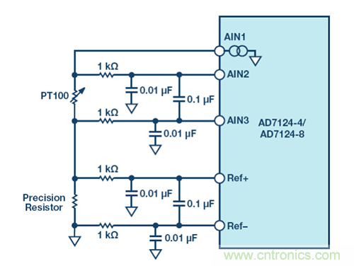使容性 PGA 性能與阻性 PGA 相當(dāng)?shù)目尚修k法是以更高的電源電壓對(duì)電橋供電。比如,以±3.3 V 雙極性電源對(duì)電橋供電,從而增加應(yīng)變計(jì)的靈敏度,但代價(jià)是更高的系統(tǒng)復(fù)雜性和功耗??赡軙?huì)得益于容性 PGA 的另一個(gè)例子是采用電阻式溫度檢測(cè)器(RTD)或熱電偶的溫度測(cè)量應(yīng)用。常用 RTD 電阻(比如 PT100)可以用來(lái)直接檢測(cè)溫度,或間接檢測(cè)熱電偶的冷結(jié),如圖 9 所示。