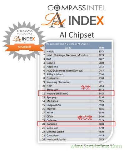 前不久,市場研究公司Compass Intelligence發(fā)布了全球AI芯片企業(yè)排名。Compass Intelligence是從公司表現(xiàn)、產(chǎn)品表現(xiàn)、市場表現(xiàn)、獨(dú)特市場四大維度計算出了這一結(jié)果。
