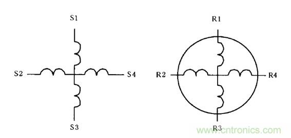 如上圖1所示,S1-S3作為勵(lì)磁繞組,S2-S4作為定子交軸繞組,兩者空間互相垂直且匝數(shù)、型式完全相同。R1-R3和R2-R4分別為轉(zhuǎn)子上的正弦輸出繞組和余弦輸出繞組,它們的結(jié)構(gòu)也完全相同。