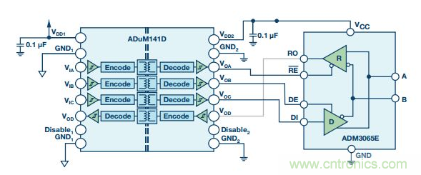 RS-485信號(hào)傳輸是平衡的差分式傳輸,本身便能抗干擾。系統(tǒng)噪聲均等地耦合到RS-485雙絞線電纜中的每條導(dǎo)線。一個(gè)信號(hào)的發(fā)射與另一個(gè)信號(hào)相反,耦合到RS-485總線的電磁場(chǎng)彼此抵消。這降低了系統(tǒng)的電磁干擾(EMI)。此外,ADM3065E增強(qiáng)的2.1 V驅(qū)動(dòng)強(qiáng)度支持在通信中實(shí)現(xiàn)更高的信噪比(SNR)。給ADM3065E增加信號(hào)隔離可利用ADuM141D 輕松實(shí)現(xiàn)。