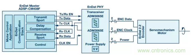 伺服驅(qū)動(dòng)器和ABS編碼器之間的RS-485通信鏈路通常要求最高達(dá) 16 MHz的高數(shù)據(jù)速率和低傳播延遲時(shí)序規(guī)格。RS-485線纜延伸長(zhǎng)度最大值通常是50米,但有時(shí)候也可能長(zhǎng)達(dá)150米。對(duì)數(shù)據(jù)通信而言,電機(jī)控制編碼器應(yīng)用是具有挑戰(zhàn)性的環(huán)境,因?yàn)殡姎庠肼暫烷L(zhǎng)電纜會(huì)影響RS-485信號(hào)傳輸?shù)耐暾浴1疚闹攸c(diǎn)闡述電機(jī)控制應(yīng)用采用ADI50 Mbps (25 MHz) ADM3065E RS-485收發(fā)器和ADSP-CM40x混合信號(hào)控制處理器的主要好處。
