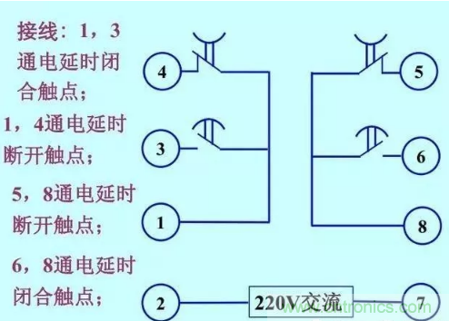 6-8腳為通電延時(shí)斷開觸點(diǎn),接通電源,給了信號(hào)之后線圈得電,等到設(shè)置時(shí)間到達(dá)以后,觸點(diǎn)斷開;