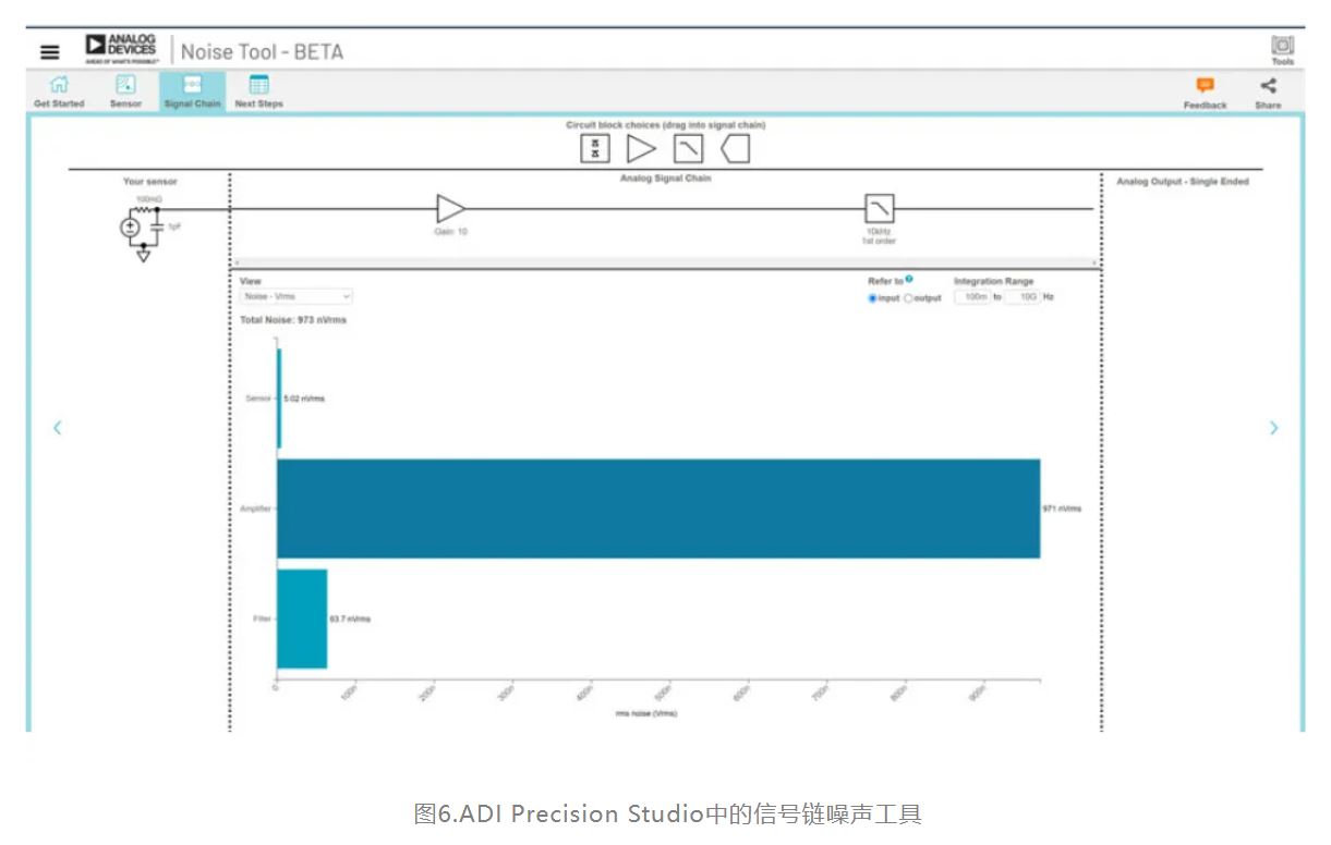 信號鏈噪聲工具 是ADI Precision Studio web工具套件的一部分,用于執(zhí)行信號鏈級的噪聲計算,包括總噪聲的積分和虛擬RTI噪聲計算。從傳感器開始構(gòu)建信號鏈,或從示例開始,然后利用信號鏈噪聲工具確定從傳感器到ADC的整個信號鏈的總噪聲和交流性能。信號鏈噪聲工具中的仿真模型使用數(shù)據(jù)手冊中的完整測量噪聲曲線來提供實驗室精度的結(jié)果。此類工具的主要優(yōu)點之一是能夠加快設計過程。該工具可即時仿真電路變化對整體噪聲性能的影響,從而加快設計迭代速度。完成后的信號鏈可導出到LTspice進行定制仿真。
