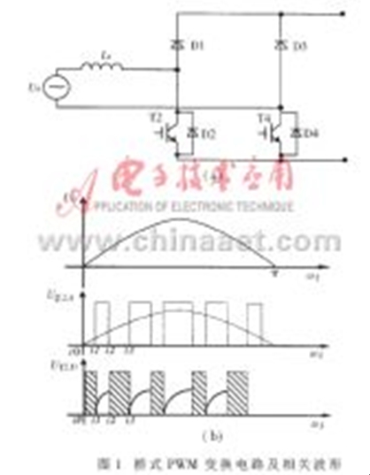 圖1(a)所示為工作在PWM整流狀態(tài)的H型橋式PWM變換電路(此圖為正弦波正半波輸入下的等效電路,上半橋的兩只IGBT未畫出),圖1(b)為下半橋兩只大功率器件的驅動信號和相關的器件波形?,F(xiàn)以正半波工作過程為例進行分析(對于三相PWM電路,在整流、逆變工作狀態(tài)或單相DC/DC工作狀態(tài)下,PWM電路的分析過程及結論基本類似)。