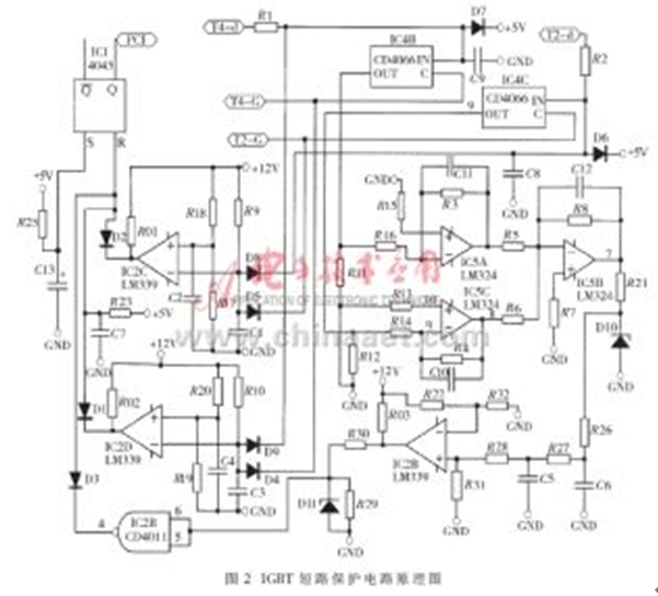 由對圖1所示電路的分析,可以得到IGBT短路保護電路的原理電路圖,如圖2所示。在圖2所示電路中, IC4及其外圍器件構成選通邏輯電路,由IC5及其外圍器件構成濾波及放大電路,IC2及其外圍器件構成門限比較電路,IC1及其外圍器件構成保持電路。正常情況下,D1、D2、D3的陰極所連接的IC2D、IC2C及CD4011的輸出均為高電平,IC1的輸出狀態(tài)不會改變。假設由于某種原因,在給T2發(fā)驅動信號的時候,H型橋式PWM變換電路的左半橋下管T2的管壓降異常升高(設電平值為“高”),即T2-d端電壓異常升高,則該高電平UT2-d通過R2加在D8的陰極;同時,發(fā)給T2的高電平驅動信號也加在二極管D5的陰極。對IC2C來說,其反相輸入端為高電平,若該電平值大于同相輸入端的門檻電平值的話,則IC2C輸出為“低”。該“低”電平通過D2加在R-S觸發(fā)器IC1的R輸入端,使其輸出端Q的輸出電平翻轉,向控制系統(tǒng)發(fā)出IGBT故障報警信號。如果是由于右半橋下管T4的管壓降異常升高而引起IC2D輸出為“低”,則該“低”電平通過D1加在R-S觸發(fā)器IC1的R輸入端,使其輸出端Q的輸出電平翻轉,向控制系統(tǒng)發(fā)出IGBT故障報警信號。由IC5A和IC5C及其外圍器件構成的濾波及放大電路將選通電路送來的描述IGBT管壓降的電壓信號進行預處理后,送給由IC5B構成的加法器進行運算處理。若加法器的輸出電平大于由R22和R32確定的門檻電平,則會使R-S觸發(fā)器IC1的R端的第三個輸入端為“低”,也向控制系統(tǒng)發(fā)出IGBT故障報警信號。改變由R22和R32確定的門檻電平,就可以靈活地改變這第三路報警信號所代表的物理意義,從而靈活地設計保護電路。圖2中的端子T4-d、T2-d,分別接在T4、T2的集電極上,T4-G、T2-G分別接IGBT器件T4、T2的驅動信號。在電路設計時應該特別注意的是,D8、D5、D9、D4必須采用快速恢復二極管。