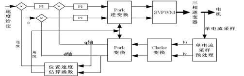 電機(jī)通過(guò)單電流采樣得到兩個(gè)采樣電流值,通過(guò)電流識(shí)別方法,計(jì)算出三相電流,利用Clarke和Park變換將電流映射到d、q坐標(biāo)系下,估算出角度和速度值,通過(guò)結(jié)合了積分分離的PI控制算法,完成對(duì)電機(jī)的反饋控制,然后經(jīng)過(guò)Park逆變換,生成了新的SVPWM波,完成一次循環(huán)。這里用到的位置、速度估算函數(shù)由于篇幅所限,將另做描述。