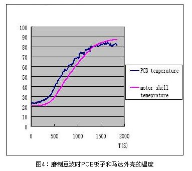 用上文所述的PPTC設(shè)計流程可以用在多功能豆?jié){機(jī)馬達(dá)防堵保護(hù)設(shè)計中,但這是往往會碰到選擇PPTC型號困難的問題,也就是說多功能豆?jié){機(jī)的馬達(dá)保護(hù)設(shè)計會較普通的小家電馬達(dá)保護(hù)復(fù)雜的多,圖4為磨制豆?jié){時PCB板周圍環(huán)境溫度和馬達(dá)外殼溫度的實(shí)測圖,可見控制電路PCB板PPTC周圍的環(huán)境溫度最高可以到達(dá)85C。由于豆?jié){機(jī)的PPTC最高環(huán)境溫度85度會比普通的小家電最高環(huán)境溫度要求高,這樣既要在85度的最大工作電流下能正常工作,還要保證在最低溫度0度的堵轉(zhuǎn)電流情況下能及時的保護(hù),相應(yīng)的就增大了設(shè)計難度。下面就具體的闡述此類多功能豆?jié){機(jī)馬達(dá)堵轉(zhuǎn)的保護(hù)設(shè)計方案。