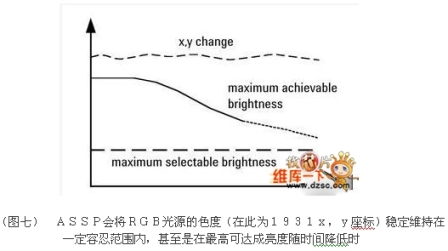 另一點(diǎn)相當(dāng)重要,同時(shí)必須注意的是,當(dāng)LED使用時(shí)間越久,光輸出強(qiáng)度就會降低,因此經(jīng)過一段時(shí)間后,RGB LED系統(tǒng)的最大可輸出亮度將會下降,雖然在大部分的應(yīng)用事實(shí)上都可以接受逐漸且穩(wěn)定的亮度衰減,但有時(shí)無法接受的是RGB發(fā)光系統(tǒng)色度的變化,ASSP擁有能夠穩(wěn)定控制RGB發(fā)光系統(tǒng)光度衰減的功能,例如維持色度的穩(wěn)定在一定的容忍度內(nèi),甚至當(dāng)最高可輸出亮度下降時(shí)。